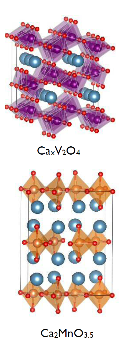 We describe two calcium transition metal oxides which can be used as active materials of a positive electrode in a clacium-based secondary battery Ca2MnO3.5 and CaXV2O4.