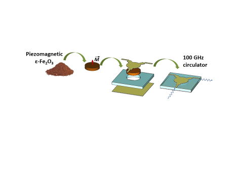 We present a new method for the synthesis of piezomagnetic ε-Fe2O3 nanoparticles of sizes above 25 nm. The nanoparticles can be used for the manufacturing of magnetic memories or wireless communication devices as self-biased non-reciprocal devices, such as miniaturized circulators for highfrequency (above 100 GHz) wireless communications.